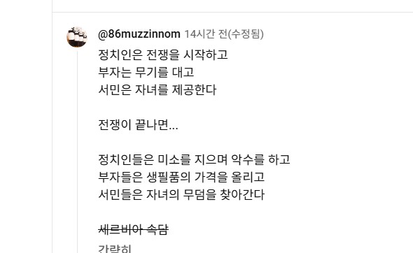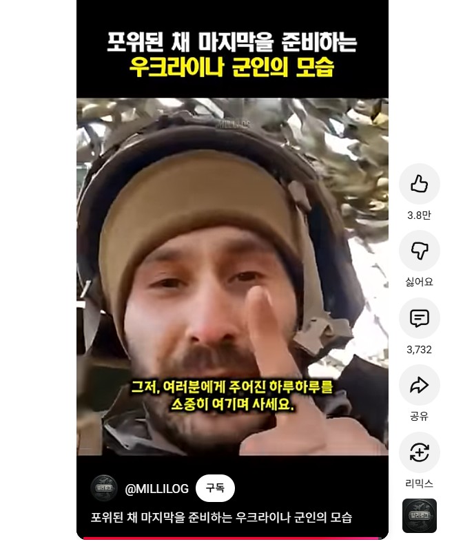 전쟁이 빨리 끝나야하는 이유futurecurrency (72)in #zzan • 7 days ago 유튜브보다가 러시아군에 포위된 우크라병사들의 쇼츠가 하나 있기에봤는데.. 짠하더라구요 댓글중에 너무 와닿아서 같이 올려봄 정치인이전쟁을 시작하고 부자는 무기를 대고 서민은자녀를 제공한다, 1년전 윤틀러가 젊은 군인들 이용한게 그런거죠, 쓰레기같은 노망난 노친네들이 나라를 이끌면 어떻게되는지잘보여주는 사례죠 빨리 네타내후 이넘을 감옥에보내야 세상이 편해질거 같습니다, 푸틴은당뇨로 빨랑 저세상 가던가 해야할거같구 오늘도 화이팅 #mini #dblog #kr #krsuccess #diary #life #palnet