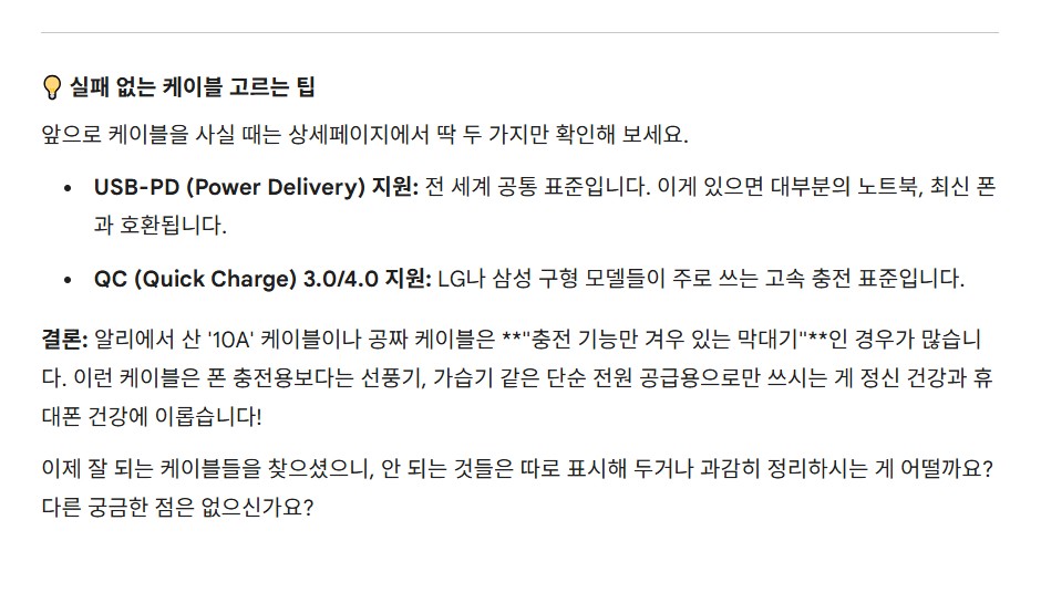 알리발 쓰레기..futurecurrency (72)in #zzan • 4 days ago (edited) 알리에서 많은물품을 사긴하는데..충전케이블은 절대사지말아야할거 같습니다 스펙은 10암페어 고속케이블인데 이게 펑스펙이라 휴대폰이 민감한기종이면 충전이 안된다고 나오네요 저도 처음에 잘스다가 언제부터안되더라구요,무조건 국내기업이보내는 제품이나(중국제조라도) 다이소에서 사는게 맘편할거 같습니다 제미나이에 문의해보니 같은 답을주네요 버리고 있는 케이블을 돌려가면서 써야할거 같습니다 알리에서 버리는것도 참많네요 흐흐 오늘도 화이팅 #mini #dblog #kr #krsuccess #diary #life #palnet