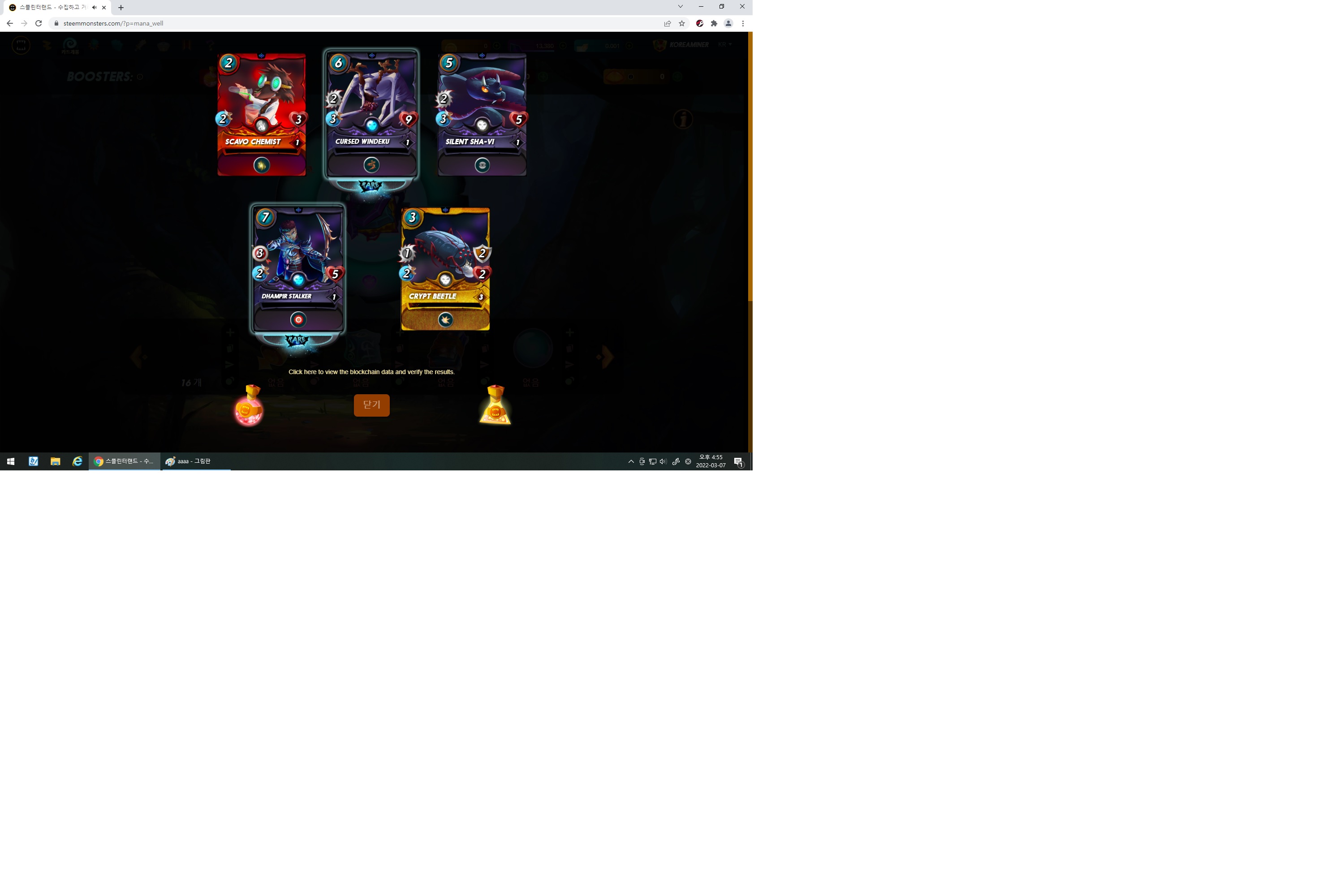 스몬이야기koreaminer (75)in #zzan • 4 years ago 우크라이나 전쟁이 장기화되면서 전쟁에 대한 리스크와 러시아의 디폴트 가능성이 대두되면서 큰폭의 하락을 나타내는 금융시장입니다. 원유가격은 어느새 $130이 넘었다고 하네요. 러시아 사태로 많이 불안한 금융시장이어서 오늘은 스몬게임할 마음이 나지않아 카오스팩을 하나 개봉해보았습니다. 노멀급이지만 골드카드 하나와 희귀급2개 받을수 있었네요. 시장이 너무 불안해서 러시아 리스크가 빨리 해결되길 희망하며 오늘하루도 성공투자 하십시요 #kr #dblog #aaa #int #marlians #ufm #steemit