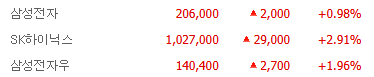 코스피 현황, 시가총액 상위 1위 ~ 3위 현황kstop1 (77)in #zzan • 18 days ago [1] 코스피 현황 코스피 지수는 5,858.87 이며, 80.86 포인트 상승하였습니다. [2] 시가총액 상위 1위 ~ 3위 현황 1위. 삼성전자 현재가 : 206,000 원 (2,000 원 상승) 2위. SK하이닉스 현재가 : 1,027,000 원 (29,000 원 상승) 3위. 삼성전자우 현재가 : 140,400 원 (2,700 원 상승) 이상입니다. #sct-kr #sct-freeboard #upfundme #dblog #aaa #neoxian #sct