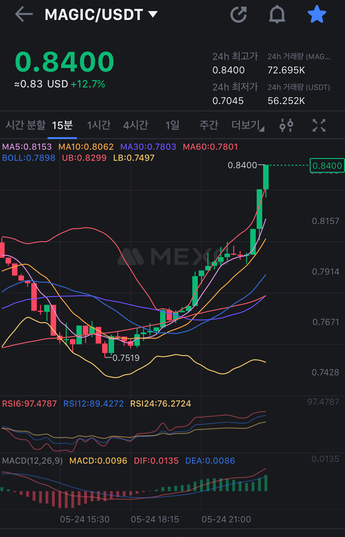 5/24 코인 시황leeyh (80)in #zzan • 2 years ago 오늘은 예상대로 Magic이 강세입니다 이더 L2 킬러 댑들이 계속오를거라 예상합니다 #kr #krsuccess