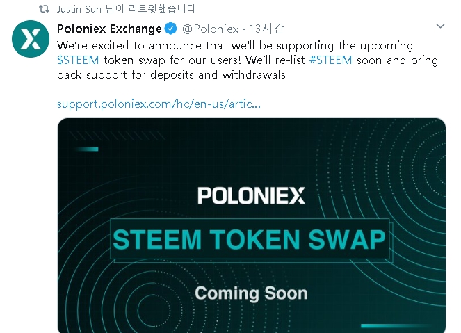 합병과동시에 트론이 인수한 폴로닉스 거래소에서는 13시간전에