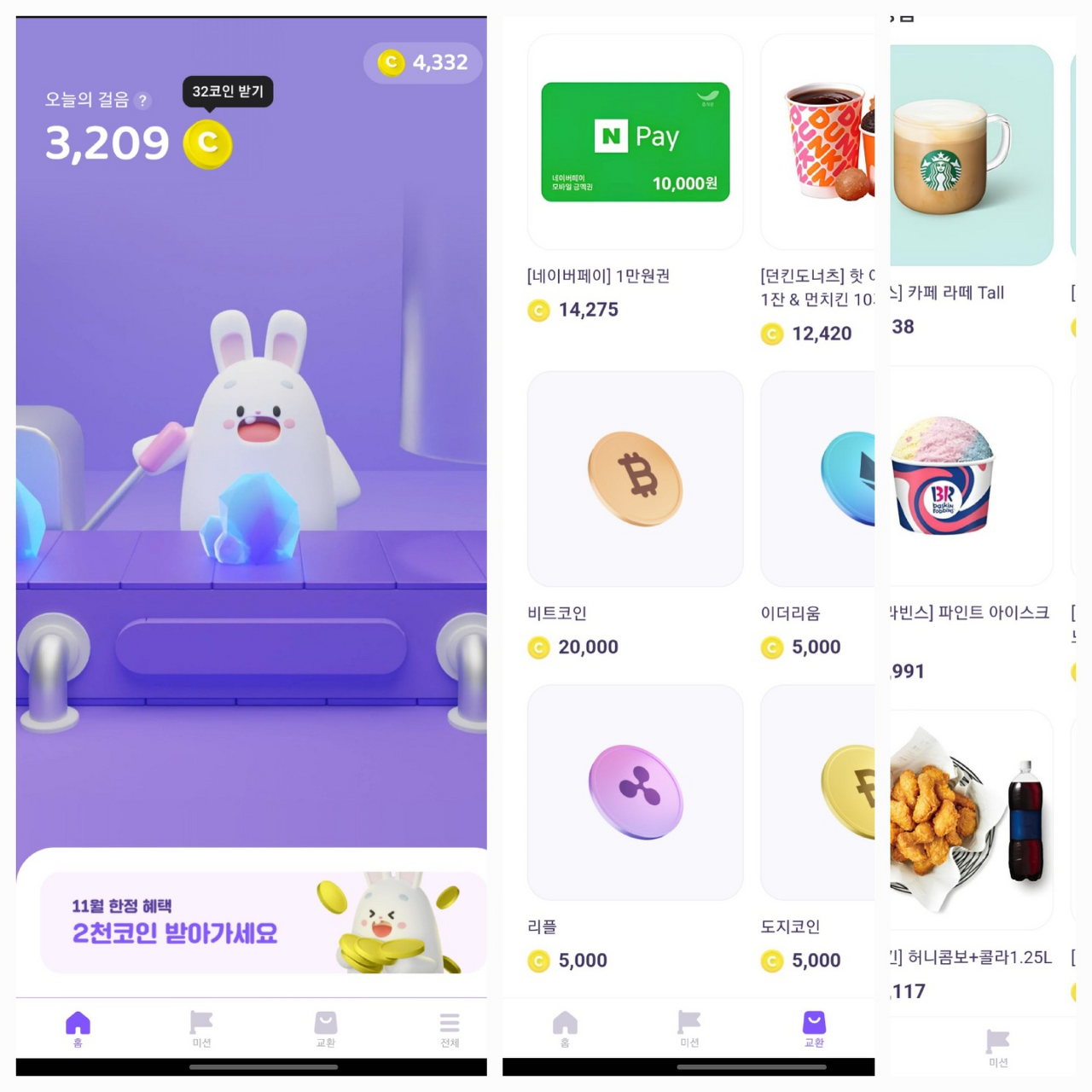 많은 만보기 앱은 포인트를 모아 다양한 기프티콘을 구매할 수 있는데요. 최근 출시된 비트버니는 포인트(코인)을 모아 비트, 이더, 도지 코인을 구매할 수 있는 앱입니다. 다른 리워드 만보기 앱과 함께 사용 가능하니 비트버니와 함께 다른 만보기 앱을 동시에 여러 개 켜고 한 번에 적립받아보세요!