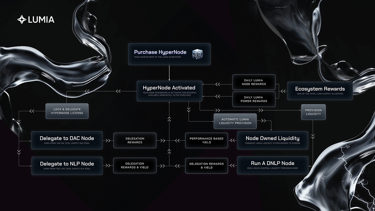 루미아 노드는 앞서 언급한 루미아 스트림의 수수료를 포함해 루미아 생태계내 발생하는 다양한 유동성 수익을 공유하는 하이퍼 노드입니다. 하이퍼 노드 보유자는 생태계 리워드, DAC 노드, DNLP 노드, 노드보유 유동성 등 다양한 풀에서 나오는 수익을 분배받습니다.