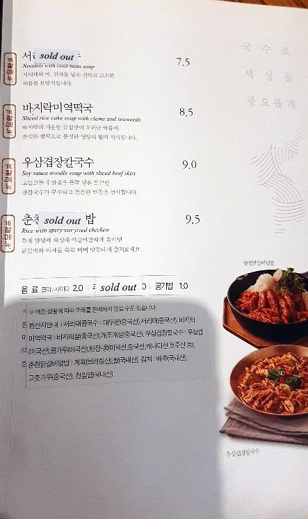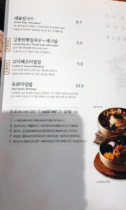 해물칼국수, 강릉 짬뽕 칼국수, 꼬막 해초비빔밥, 육회비빔밥 등이