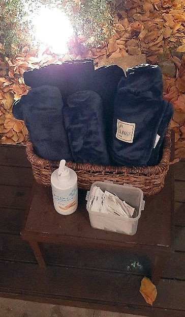 손 세정제와 함께 여러 개의 담요들이 놓여 있었어요~!