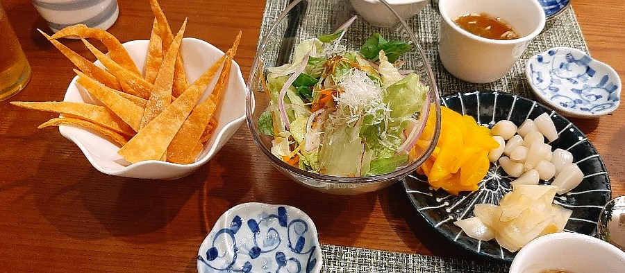 샐러드와 튀김, 단무지와 생강 등