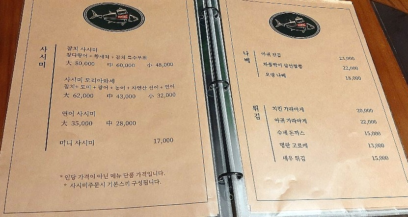 일단 생선회, 나베, 튀김, 구이, 샐러드, 스시 등