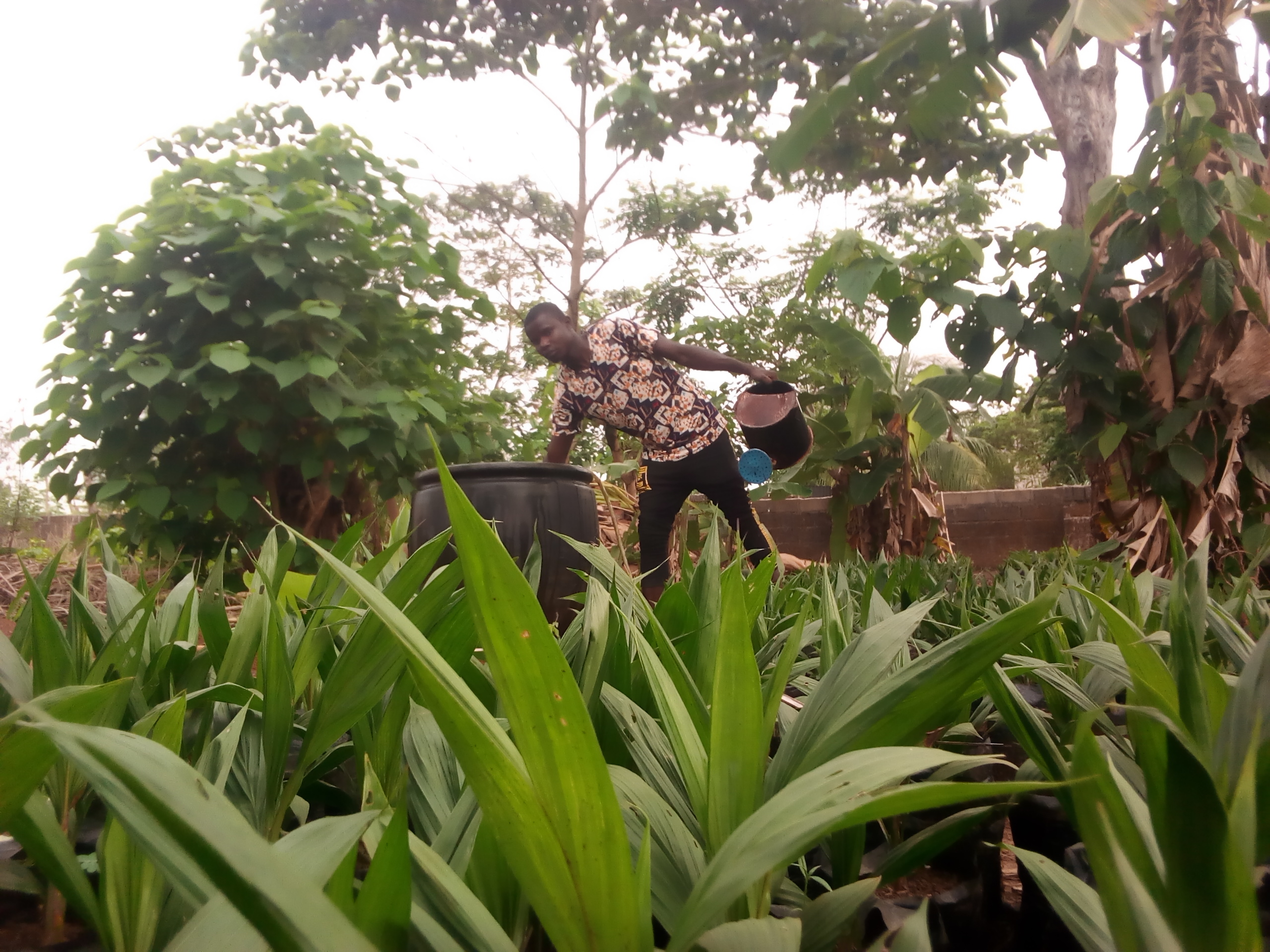 그리고 그것은 손바닥 묘목의 만 개의 폴리에틸렌으로 구성되어 있으며 1 년 6 개월이되면 판매 준비가되었습니다. 비가 내리는 일요일과 날을 제외하고는 하루에 한 번 물을주고 매일 야자수 주변에서 자라는 풀을 제거합니다.