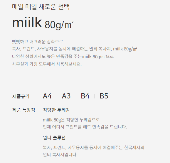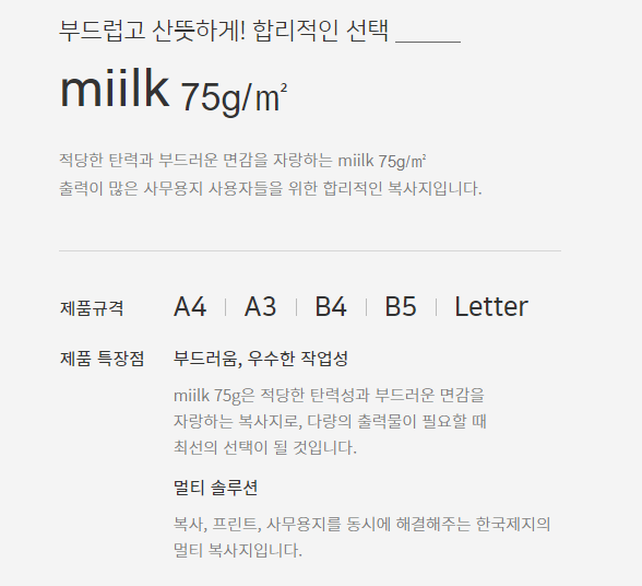 miilk 80g/㎡을 설명하는 문구 역시도 그러하네요. 그런데 한국 제지기술 정말 세계적입니다. 펄프 생산 강국 반열에는 못들어 가나 제지 생산 기술은 세계적이라 합니다.