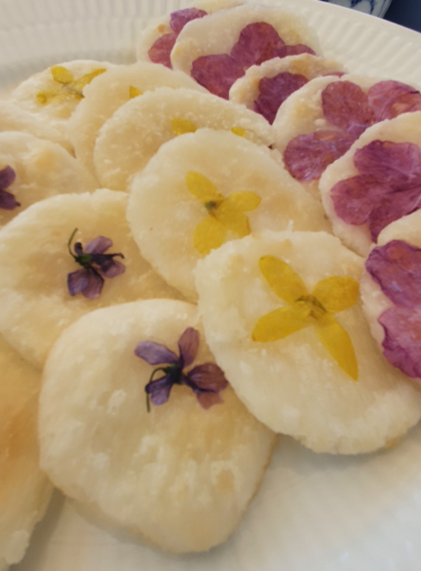 반죽은 맵쌀 찰쌀가루 반반 익반죽해서 노릇노릇 구운다음 꽃을 올립니다.