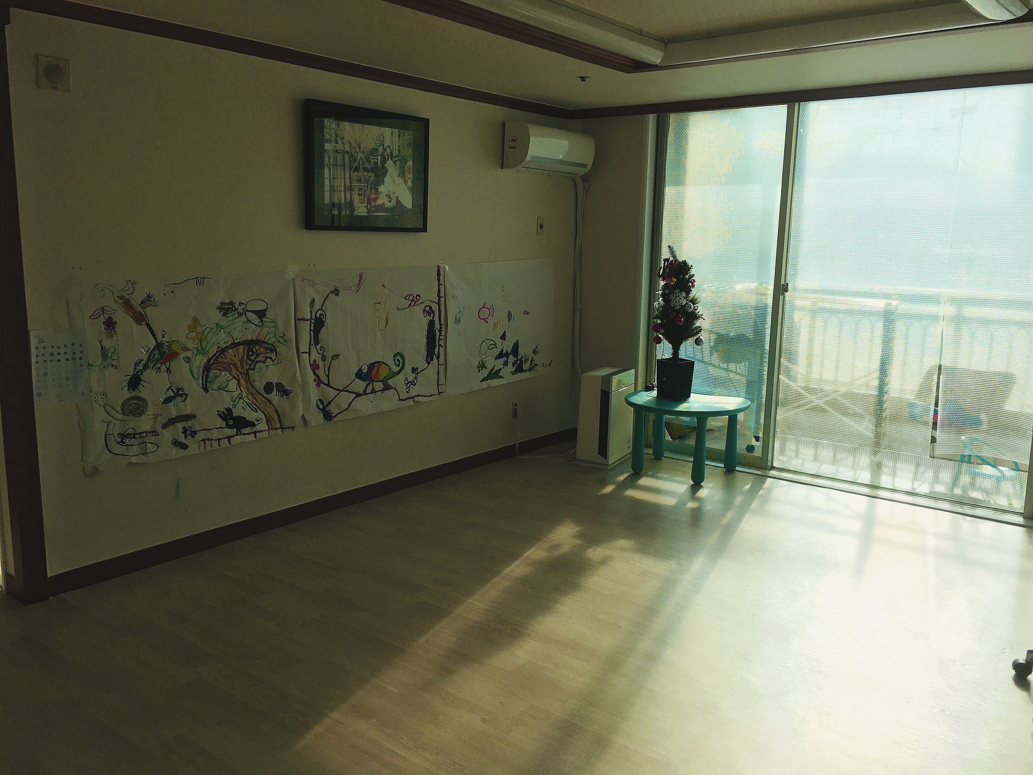 거실에 쇼파가 있는 가정은 저 곳에 쇼파를 놓겠지만, 저희 집은 보시다시피 쇼파가 없어요. 쇼파를 들이지 않은 이유가 여러 가지 있는데 첫째는 티비를 거의 보지 않기 때문에 쇼파에 앉을 일이 없고, 두번째는 아이들의 테러로 인해 망가질 염려가 있었기 때문입니다. 세번째는 굳이 많이 사용하지 않는데 큰 돈을 들일 필요가 없을 것 같다는 생각이 있었고요. 덕분에 가구가 없으니 거실이 엄청 넓게 느껴집니다. 현재는 아이 책상도 중고로 팔아서 달랑 공기청정기 하나만 자리 잡고 있네요. ^^