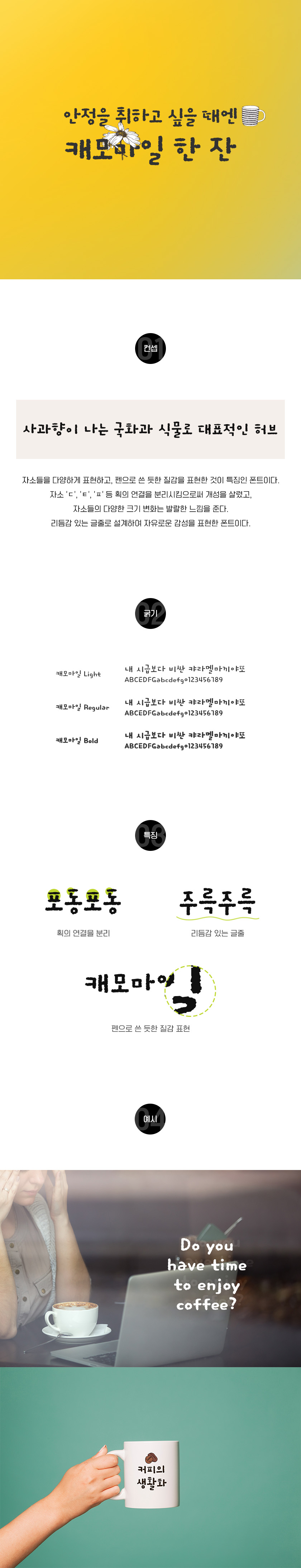 [디자인210] 캐모마일ziq (71)in #zzan • 5 years ago 오늘 소개할 서체는 디자인 210의 '캐모마일'입니다. 상업용 무료폰트는 아니지만 개인의 비상업적 용도에 한해 사용이 가능합니다. 개인적으로 사용해 보고 싶은분은 아래 링크에서 다운받으세요. 바로가기 #kr #liv #hobby #mini #aaa