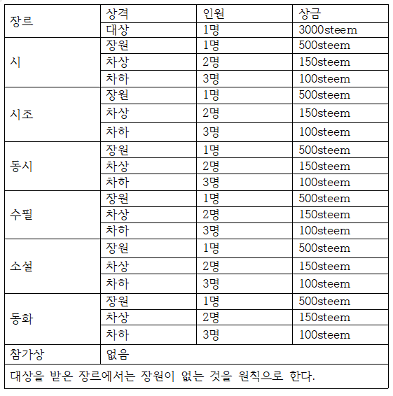 심사를 하면서 작품성과 ‘이달의 작가상’을 비롯한 steemzzang에서의 기여도를 가점으로 넣었습니다. 좋은 작품 올려주신 여러 작가님들께 감사드리며 지금까지도 그래왔듯이 많은 작가님들께서 steemzzang에서 더 많은 글을 볼 수 있기를 바라는 마음으로 제3회 zzan문학상을 준비하며 많은 작가님들과 작품을 기다리겠습니다.
